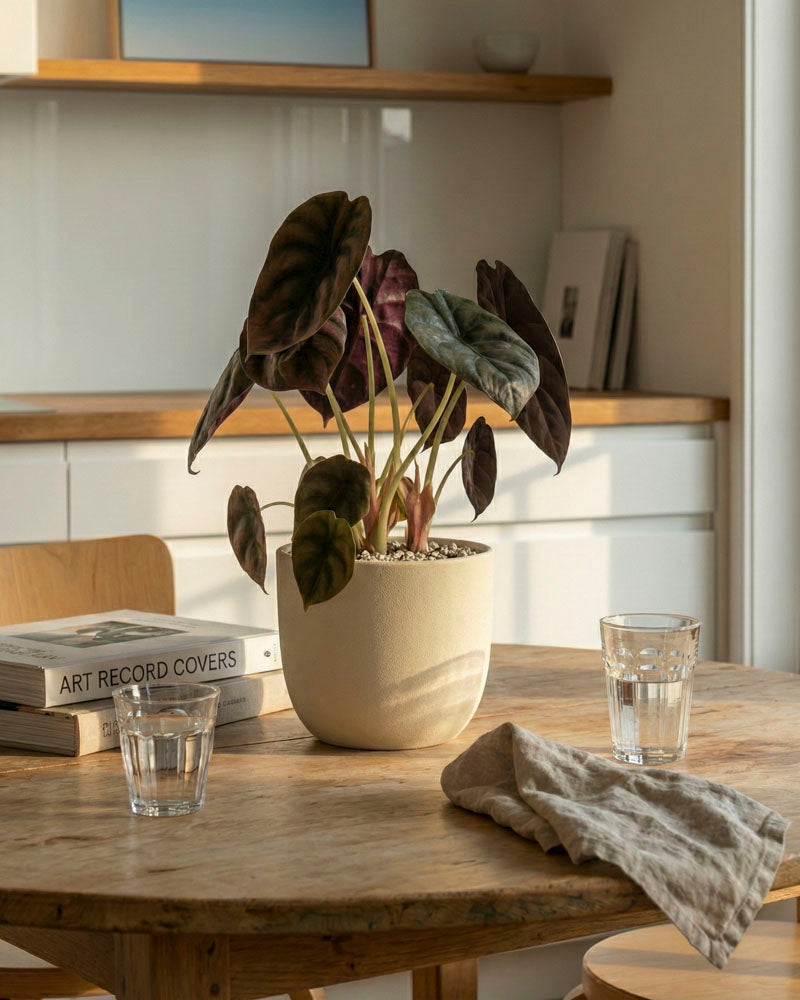 Deine Alocasia mag einen hellen bis halbschattigen Standort ohne pralle Sonne. Sie liebt hohe Luftfeuchtigkeit, darum freut sie sich über ein Badezimmer mit Fenster.