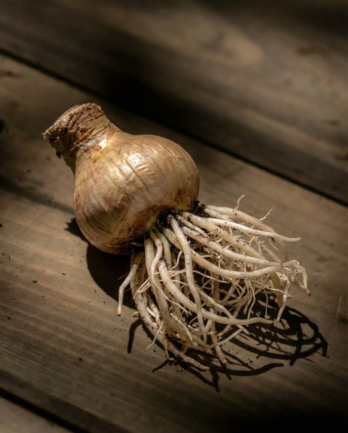 Eine Amaryllis-Zwiebel mit langen weißen Wurzeln und einer papierartigen Außenschicht liegt auf einer Holzunterlage im sanften, natürlichen Licht.