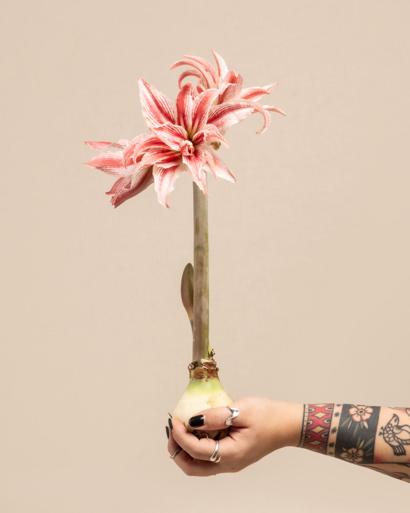 Eine Hand mit schwarzem Nagellack hält eine Amaryllis mit einem hohen grünen Stiel und rosa gestreiften Blüten vor einem schlichten beigen Hintergrund.