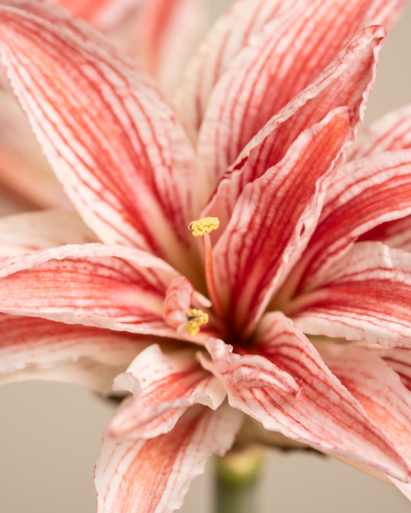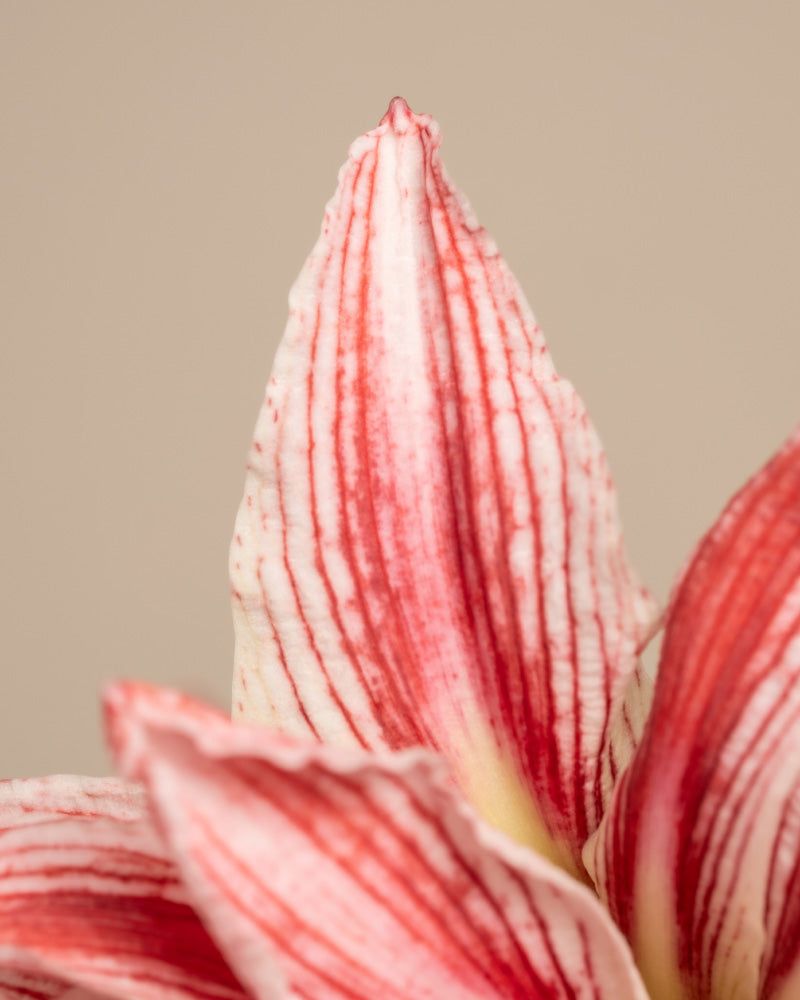 Nahaufnahme eines Amaryllisblütenblatts mit rosa und weißen Streifen auf einer strukturierten Oberfläche mit einer spitzen Spitze, zarten vertikalen Linien und vor einem neutralen beigen Hintergrund.