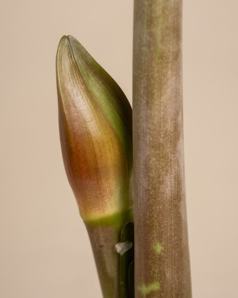 Nahaufnahme einer grünen und rötlichen Amaryllis-Blütenknospe neben ihrem hohen aufrechten Stiel, beide vor einem einfarbig beigen Hintergrund.