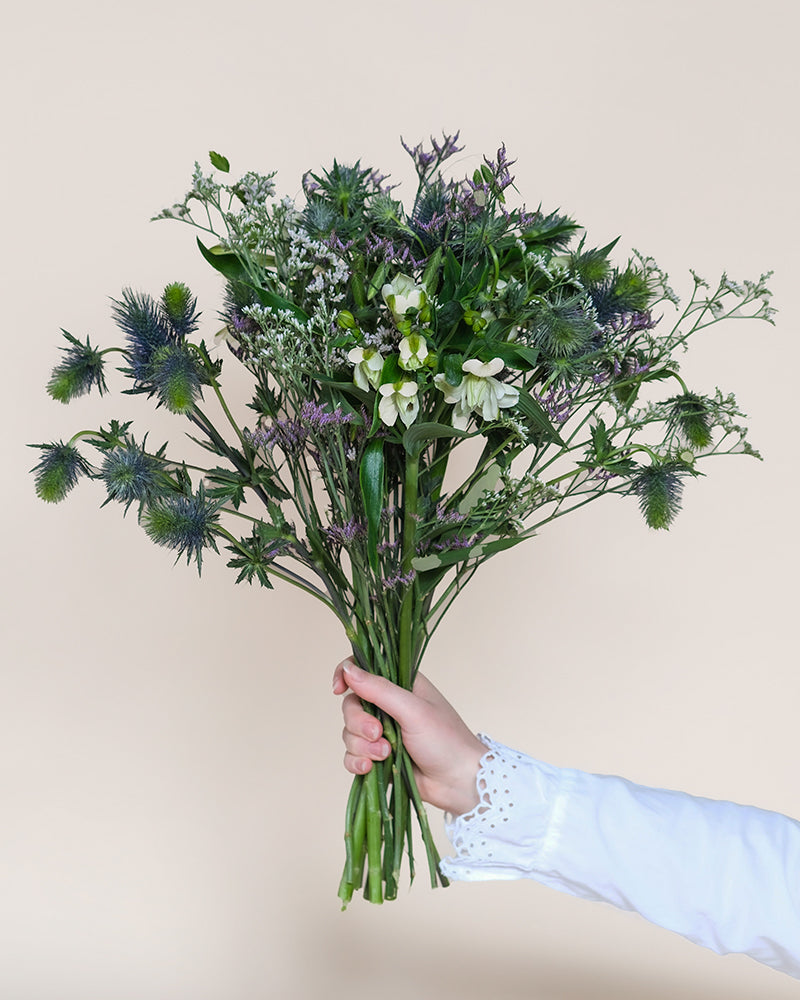 Eine Person in einem weißen Hemd mit Ösenmanschetten hält den "Wanderlust"-Blumenstrauß - grüne Blätter, weiße Blütenblätter und stachelige blaue distelähnliche Blumen - in der Hand, um die Natur vor einem hellbeigen Hintergrund in Szene zu setzen.