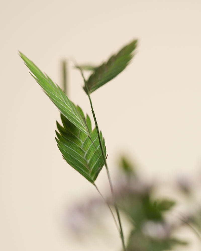 Nahaufnahme von zarten grünen Blättern mit gezackten Rändern an einem dünnen Stiel vor einem weichen beigen Hintergrund. Der Fokus liegt auf dem Blatt im Vordergrund und erinnert an die Frische und Klarheit des Fernwehs, während der Rest sanft verschwommen bleibt.