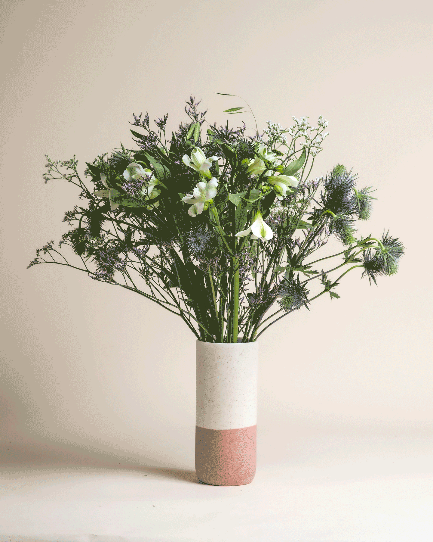 Die Keramikvase "Wanderlust" mit weißem und rosafarbenem Blockdesign enthält grüne und weiße Blumen, üppiges Grün und blaue Disteln, die an die Frische der Bergluft vor einem schlichten beigen Hintergrund erinnern.