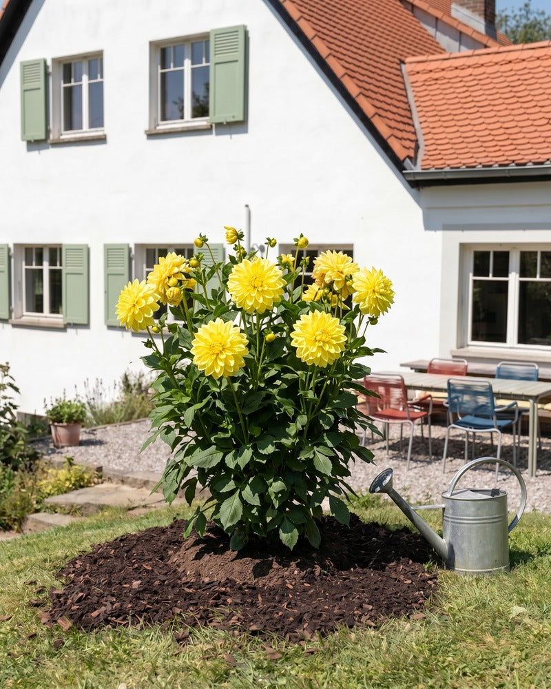 Gelbe Dahlie in voller Blüte im Gartenbeet vor einem Landhaus mit Zinkgießkanne
