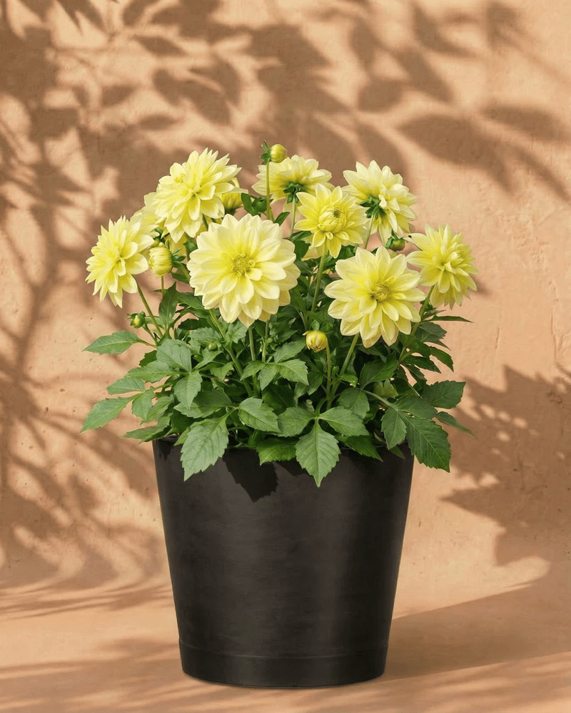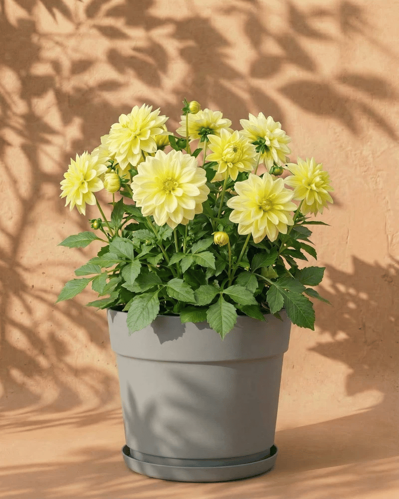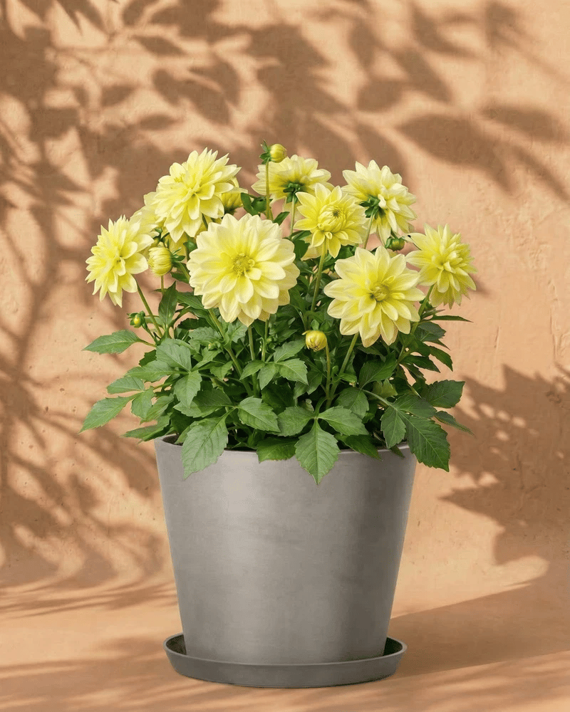 Gelbe Dahlie im dunkelgrauen Amsterdam-Übertopf mit Untersetzer vor warmer Wand