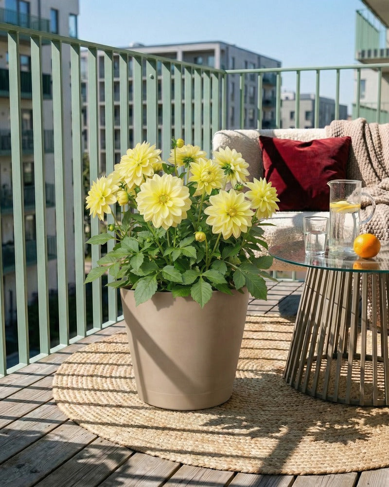 Gelbe Dahlie im beigen Topf auf einem sonnigen Balkon mit Lounge-Sofa