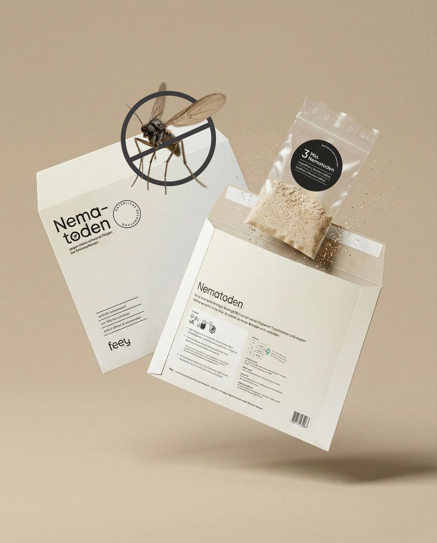 Eine "Nematoden gegen Trauermücken"-Verpackung mit Infotext, sichtbarem Granulat in einem durchsichtigen Beutel und einer Mückenillustration - perfekt für die Bekämpfung von Trauermücken in Zimmerpflanzen - auf einem beigen Hintergrund.