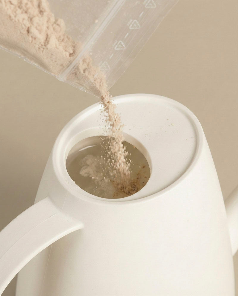 Eine weiße Gießkanne ist mit beigefarbenem Pulver aus einem Plastikbeutel gefüllt - wahrscheinlich Nematoden gegen Trauermücken" -, was darauf hindeutet, dass es für die Herstellung einer Lösung für Zimmerpflanzen zur Vorbeugung oder Behandlung von Trauermückenbefall vorbereitet wird.