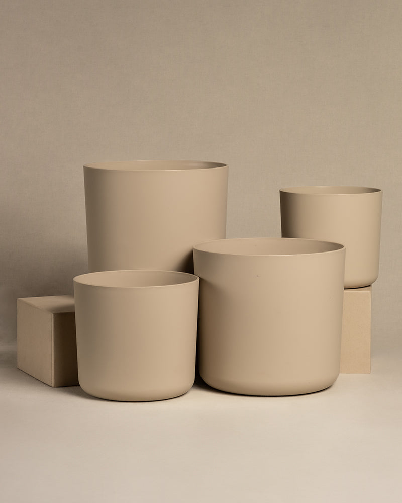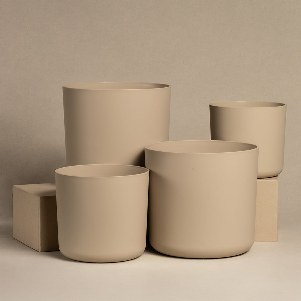 Vier beigefarbene zylindrische Töpfe aus dem Kunststoff-Topfset „Lumi“ (Größen 22, 18 und 16) sind vor einem schlichten Hintergrund angeordnet. Ein kleiner Würfel hebt einen der Töpfe hervor und schafft so eine ausgewogene Komposition. Die glatte, matte Oberfläche dieser Töpfe verkörpert ein schlichtes Design, das jeden Raum ergänzt.