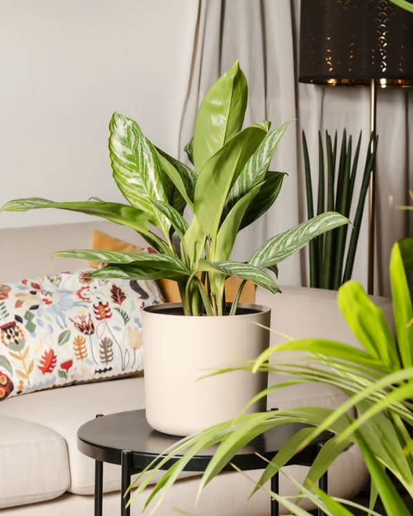 Eine große Zimmerpflanze mit breiten grünen Blättern steht auf einem schwarzen runden Tisch in einem gemütlichen Wohnzimmer. Dahinter sorgt ein helles Sofa mit einem bunten Kissen und einer weiteren Pflanze aus dem Kunststoff Topfset &