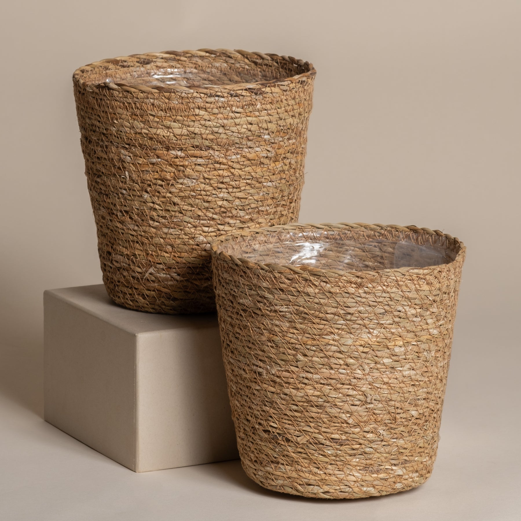 Das Pflanzkorb-Set aus Seegras (Kesat | 2× 18) zeigt zwei runde, handgeflochtene Körbe mit transparenter Innenfolie vor neutralem Hintergrund: Einer steht auf einem beigen Sockel, der andere leicht tiefer davor.