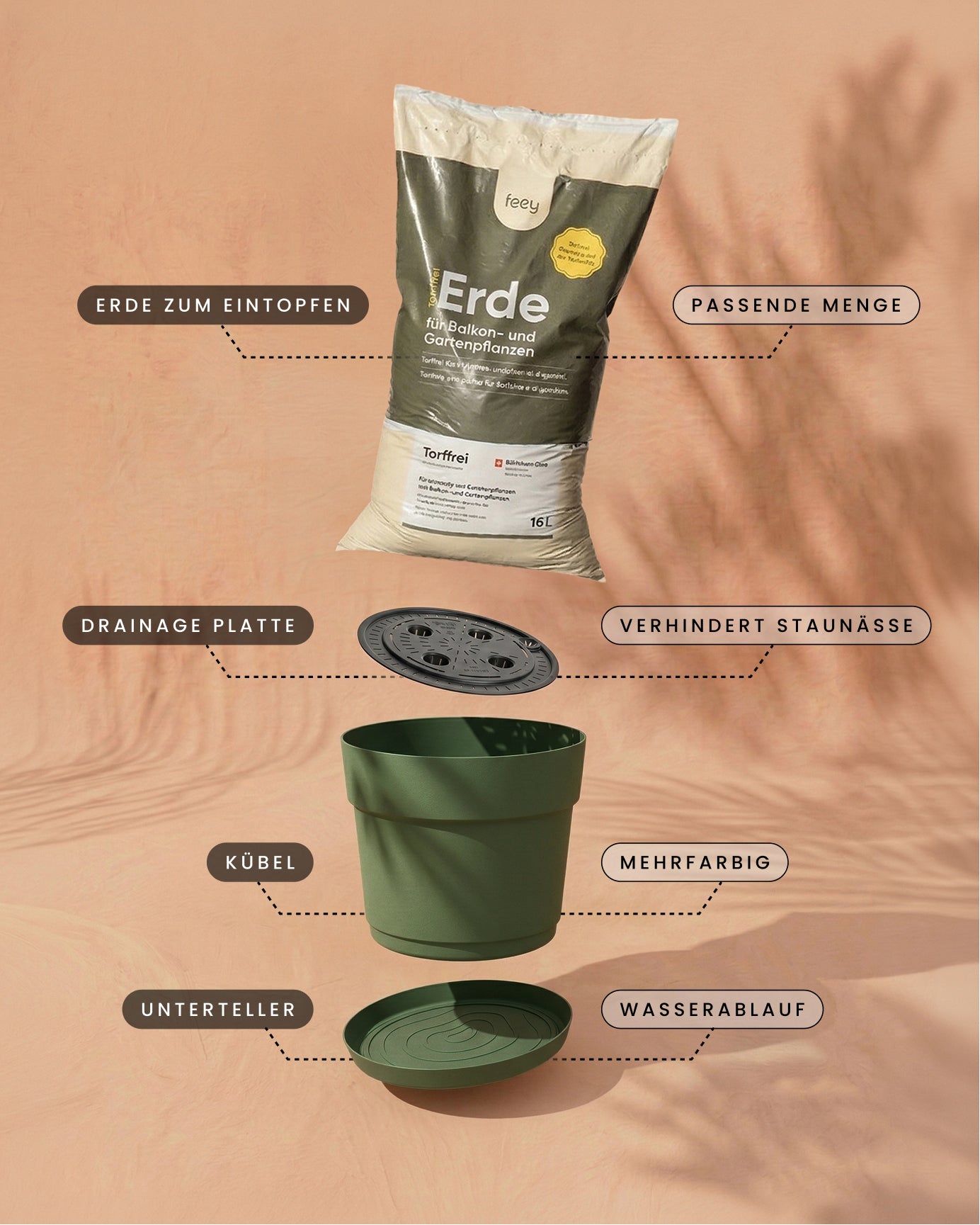 Ein beschriftetes Schaubild mit den wichtigsten Pflanzentöpfen: ein UV-beständiger Kunststoff Pflanzkübel (Bloom | 29 cm Ø) aus recyceltem Material, ein Sack Erde, eine Drainageplatte und eine passende Untertasse-jeweils auf Deutsch beschriftet.