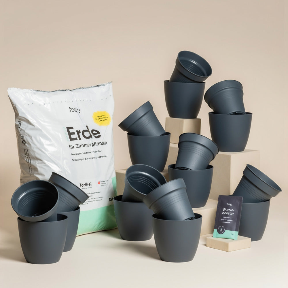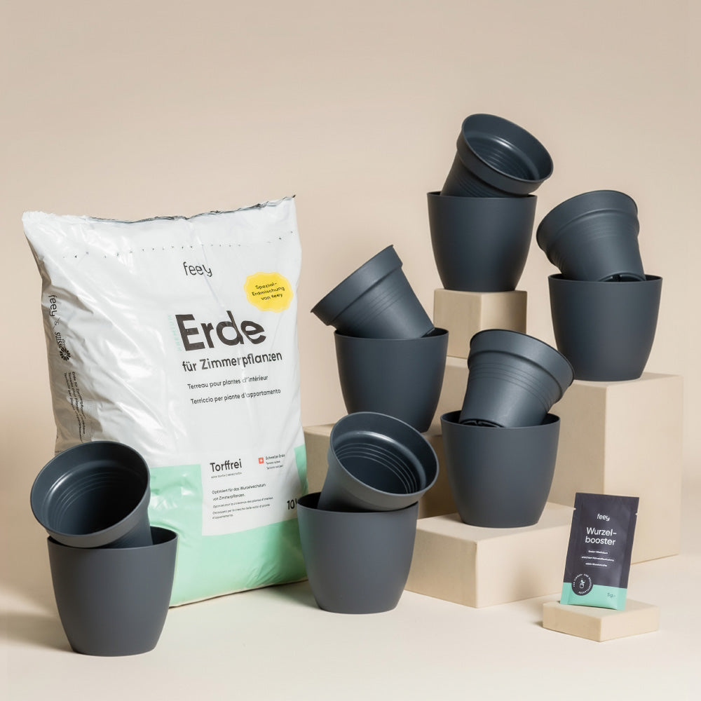 Ein Umtopfset für Babypflanzen, bestehend aus frischer Erde, fünf dunkelgrauen Pflanzentöpfen (einer davon umgekippt), einer kleinen Schachtel und einem "Wurzelbooster"-Paket, angeordnet auf einer beigen Fläche mit neutralem Hintergrund.