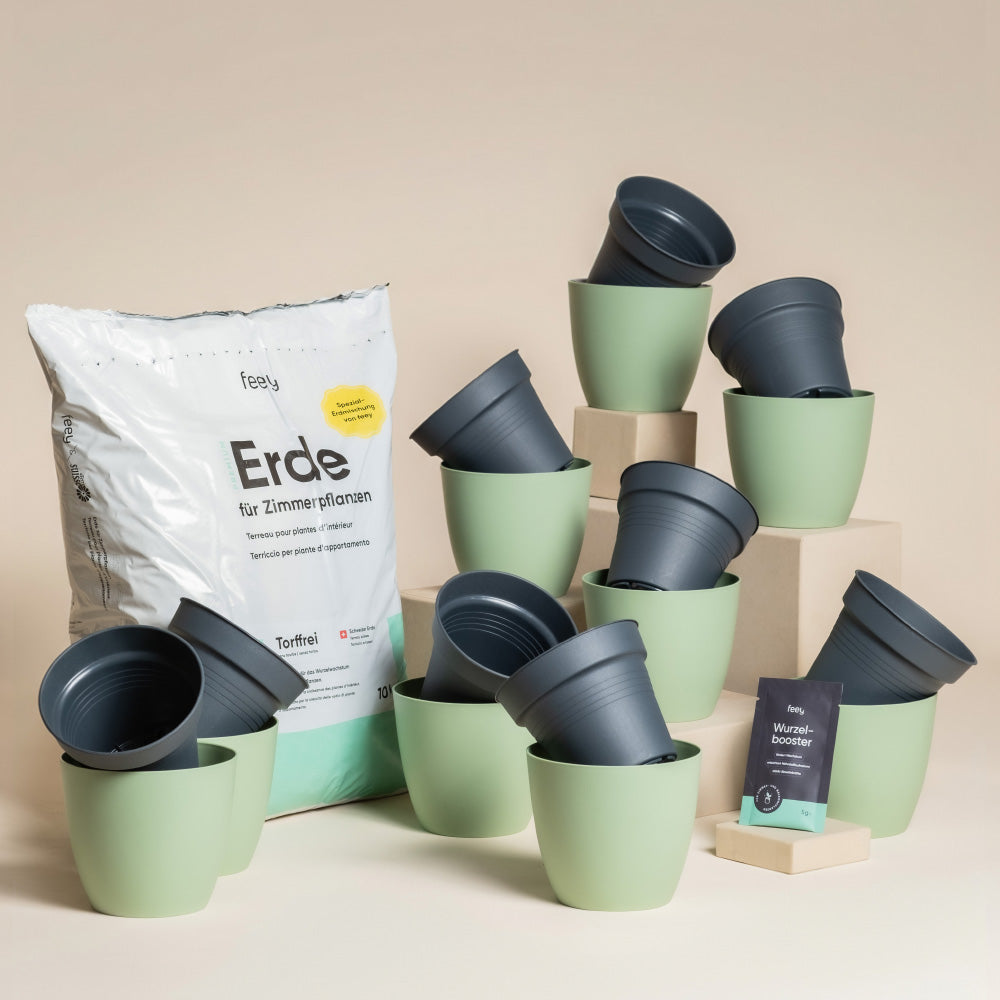 Das Umtopfset für Babypflanzen enthält grüne Pflanztöpfe mit schwarzen Innentöpfen, beige Blöcke, frische Erde und Wurzelbooster - ideal für gesundes Wachstum beim Umtopfen kleiner Pflanzen.