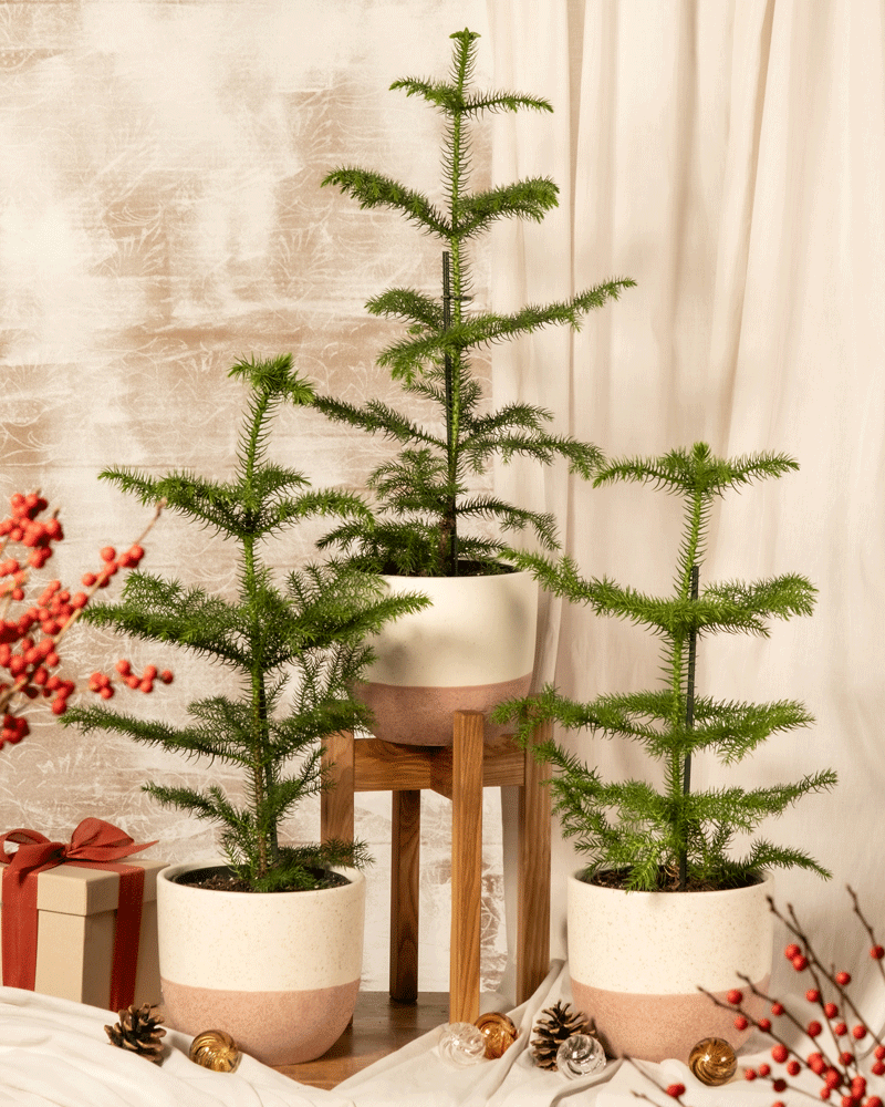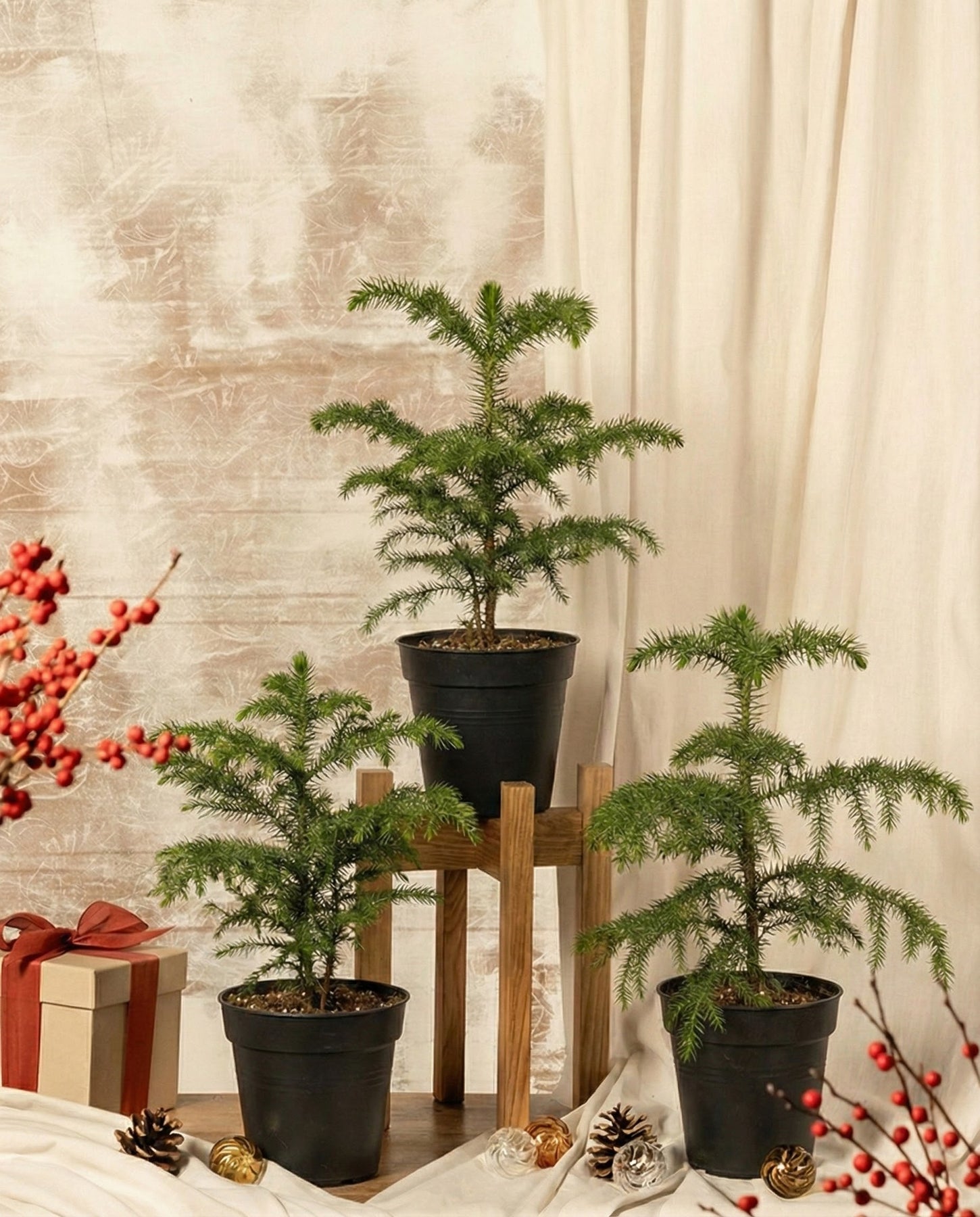 Das Zimmertannen-Trio, bestehend aus drei eingetopften Norfolk-Tannen, wird elegant vor einem beigen Hintergrund präsentiert. Einer der Bäume steht erhöht auf einem Holzständer. Die Szene ist mit roten Beeren, Tannenzapfen, einer Geschenkbox und Ornamenten geschmückt, um mit diesen umweltfreundlichen Weihnachtsbaum-Optionen eine festliche Atmosphäre zu schaffen.