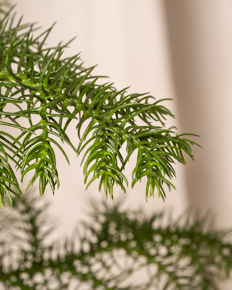 Nahaufnahme einer grünen Araukarie aus dem Zimmertannen-Trio, mit spitzen, nach außen ragenden Zweigen wie ein nachhaltiges Weihnachtsbäumchen. Die Textur ist rau und stachelig, im Kontrast zum verschwommenen grünen Laub.