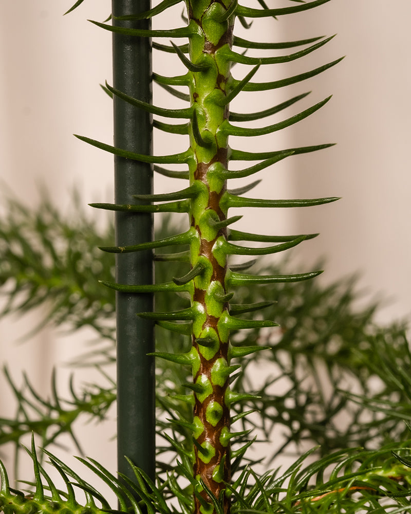 Nahaufnahme eines Astes der Araucaria araucana, auch Araukarienbaum genannt. Die dicht gepackten grünen, stacheligen Blätter entlang des Stammes vor einem neutralen Hintergrund erinnern an das „Zimmertannen-Trio“ – eine umweltfreundliche Anspielung auf einen nachhaltigen Weihnachtsbaum.