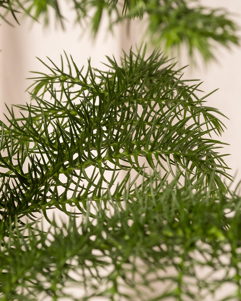 Nahaufnahme von üppigem grünem Laub mit nadelartigen Blättern, die an eine Tanne oder Kiefer erinnern. Der sanft verschwommene Hintergrund betont die komplexen und zarten Merkmale der Pflanze, ähnlich wie beim Zimmertannen-Trio – eine nachhaltige Wahl für einen Weihnachtsbaum.